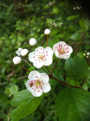 The Common Hawthorn, Crataegus monogyna, is the usual Hawthorn hedging. Along the hedgerows near the wood the Common Hawthorn buds are about to bloom, you can see the leaves are divided into pointed lobes and the flower stems are green.